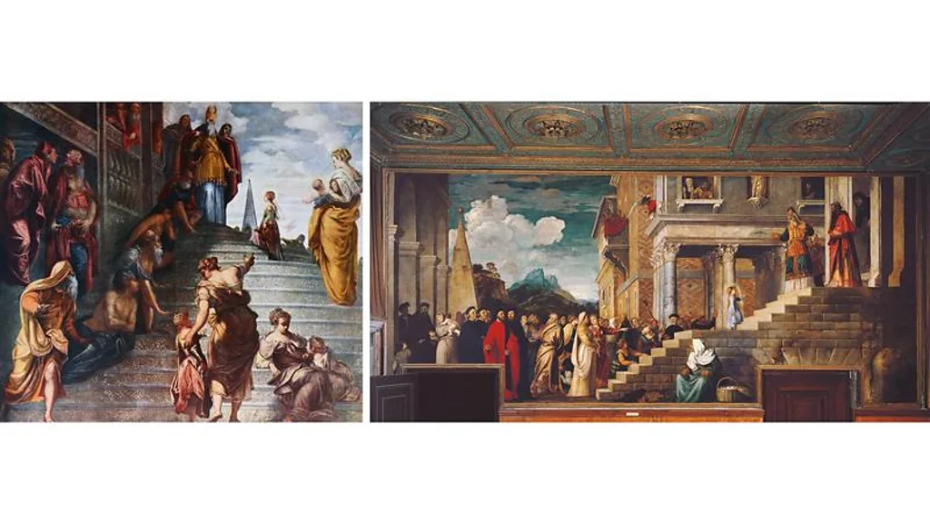 ভেনিসবাসীকে ভিন্ন এক পথ দেখানোর অঙ্গীকার নিয়ে টিন্টোরেত্তো অবশেষে (তিতিয়ান একই বিষয় নিয়ে কাজ করার প্রায় ২০ বছর পর) নিজের প্রেজেন্টেশন অব দ্য ভার্জিন সৃষ্টি করেন। যেখানে তিতিয়ানের চিত্রায়নটি পাথুরে সিঁড়ির ধাপে ধাপে, বাম দিক থেকে ডান দিকে এগোনো এক সুচিন্তিত ও পরিমিত বিন্যাসে গড়ে ওঠে, সেখানে টিন্টোরেত্তোর দৃষ্টিভঙ্গি প্রাণবন্ত ও ঊর্ধ্বমুখী; ঝলমলে সিঁড়ির ধাপ বেয়ে আমাদের দৃষ্টিকে টেনে নেয় আরও উপরে।