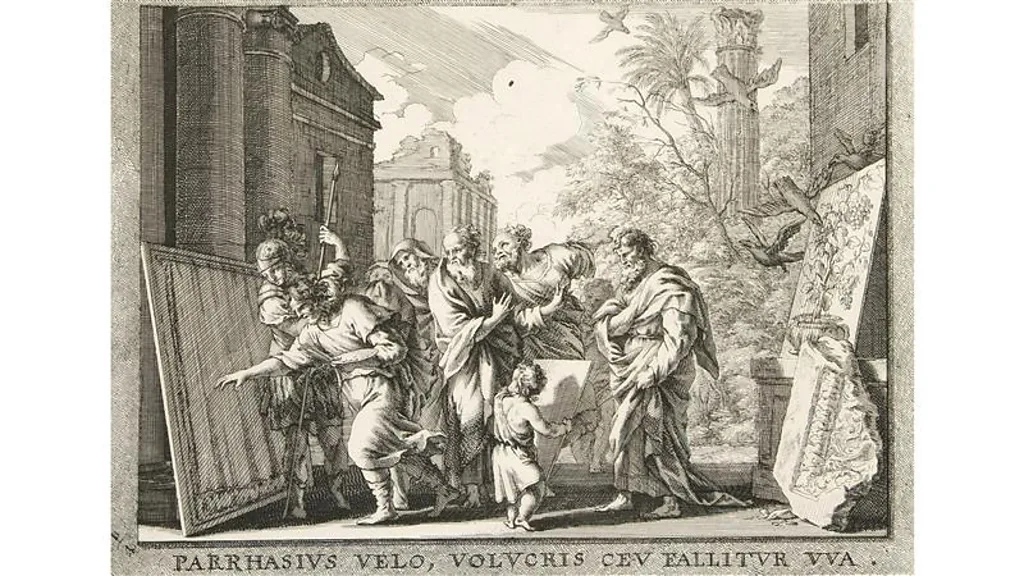 প্লিনির ন্যাচারাল হিস্ট্রি অনুযায়ী, চিত্রশিল্পী জিউক্সিস প্রাচীন গ্রীসে খ্যাতি অর্জন করেন ৯৫তম অলিম্পিয়াডের চতুর্থ বর্ষে, অর্থাৎ খ্রিষ্টপূর্ব ৩৯৭ সালে—প্রায় কয়েক দশক পর, যখন ‘অ্যাপলোডোরাস শিল্পের দরজা উন্মুক্ত করেছিলেন।’ একদিন তিনি তাঁর সহকর্মী পারহাসিয়াসকে একটি বাজির মাধ্যমে চ্যালেঞ্জ করেন। উভয় শিল্পীই প্রকৃতি অনুকরণের ক্ষেত্রে বেশ দক্ষ ছিলেন, কিন্তু এখন শ্রেষ্ঠশিল্পী কে তা খুঁজে বের করার পালা।